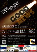 GOOD NEWS – so das Motto der Konzerte des Kirchenchores Geng unter der Leitung von Maria Burgstaller zum Jahreswechsel am 29. Dez. und 30. Dez., Beginn jeweils 19 Uhr in der Marienkirche Untergeng.
