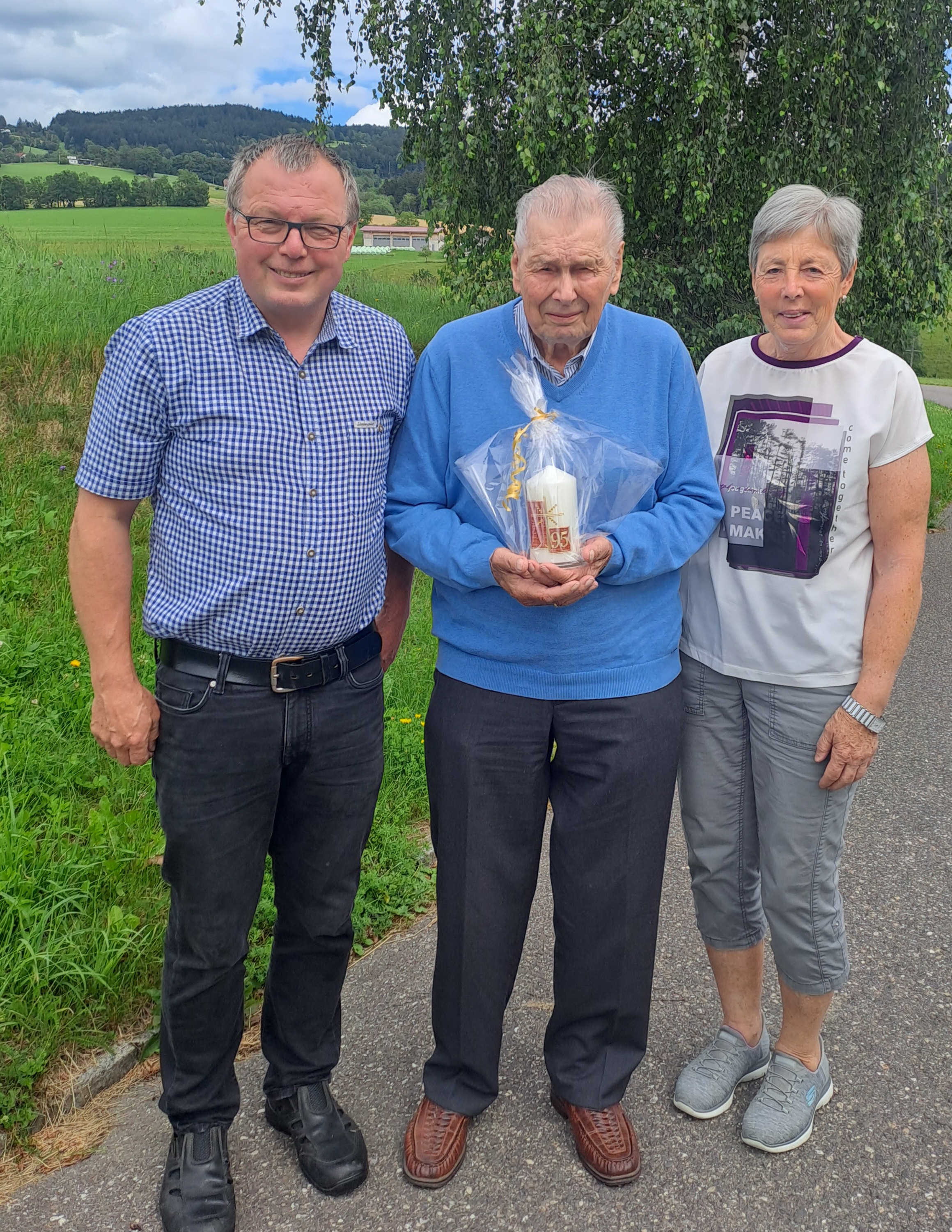 Der Bürgermeister und die Vertretung der Pfarre überbrachten dem rüstigen Jubilar die besten Glückwünsche. Der Jubilar hat wahrlich ein Kämpferherz. Bereits mit 50 Jahren hatte er nach mehreren Herzinfarkten eine schwere Herzoperation, die damals nur in Wien durchgeführt werden konnte. Autofahren geht jetzt leider nicht mehr, jedoch ist er mit seinem kleinen Gefährt, zumindest rund um sein Bauernhaus noch unterwegs.